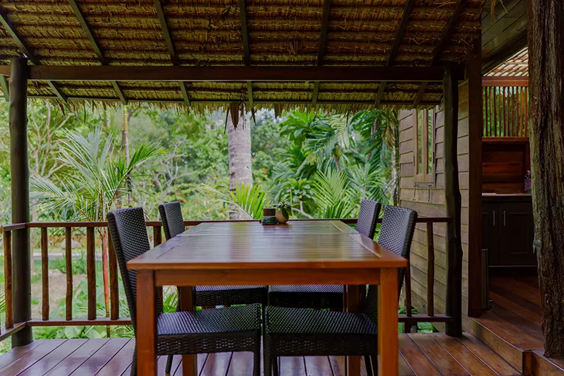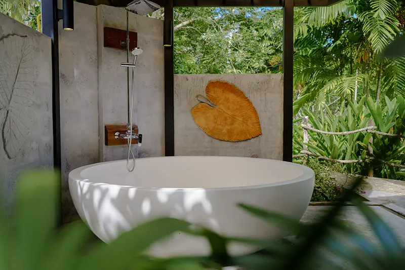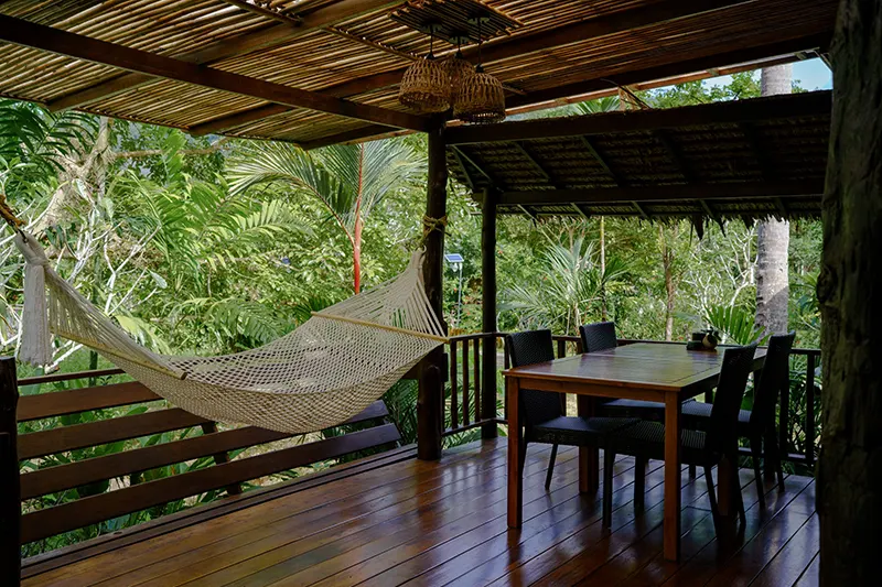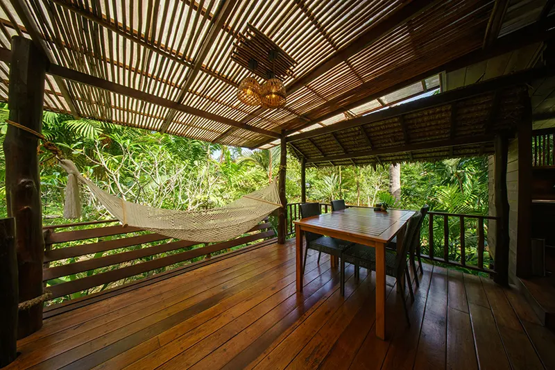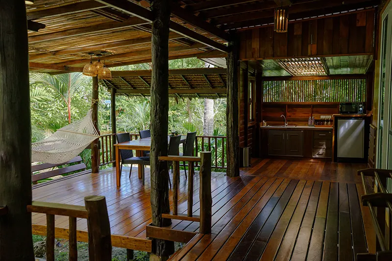 The Family Cottages, each 125 sqm, offer spacious accommodations ideal for families or groups of friends. There are two cottages, each featuring two bedrooms; one with a double bed and the other with twin beds; connected by an interior wooden door. Each bedroom has its own en-suite bathroom with hot and cold shower facilities. The cottages also boast a private terrace with a hammock, seating area, and an outdoor deep soaking bathtub, creating a perfect space for relaxation.