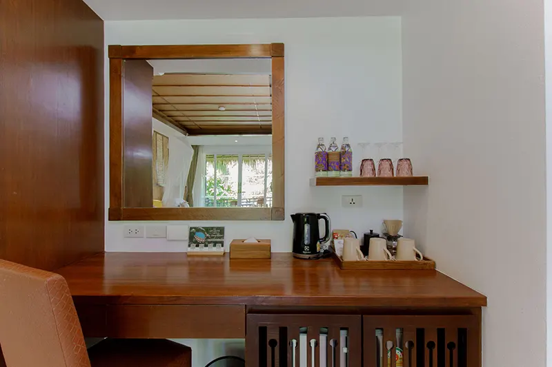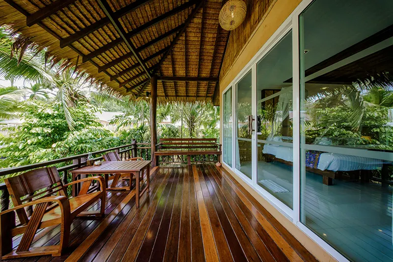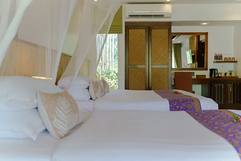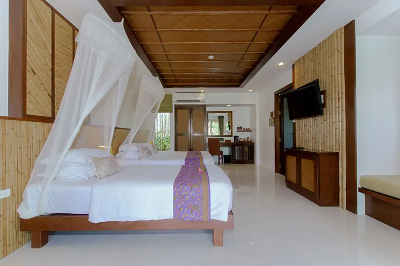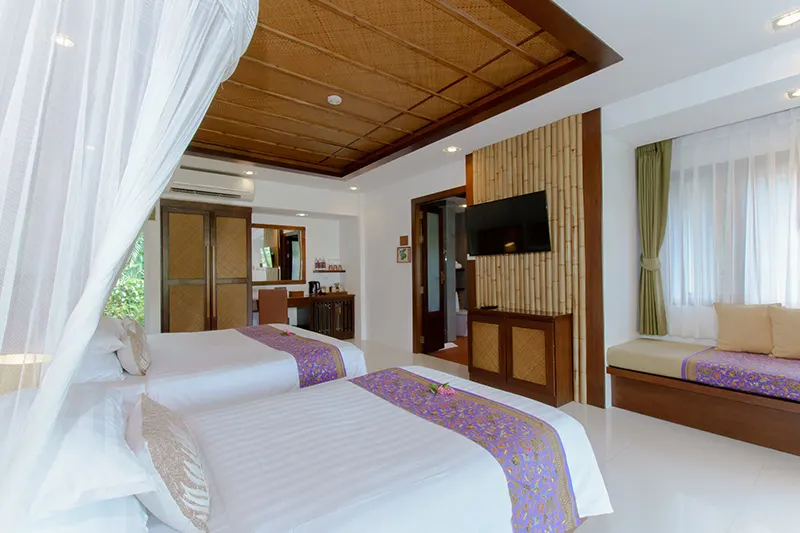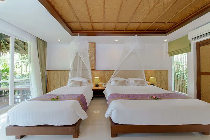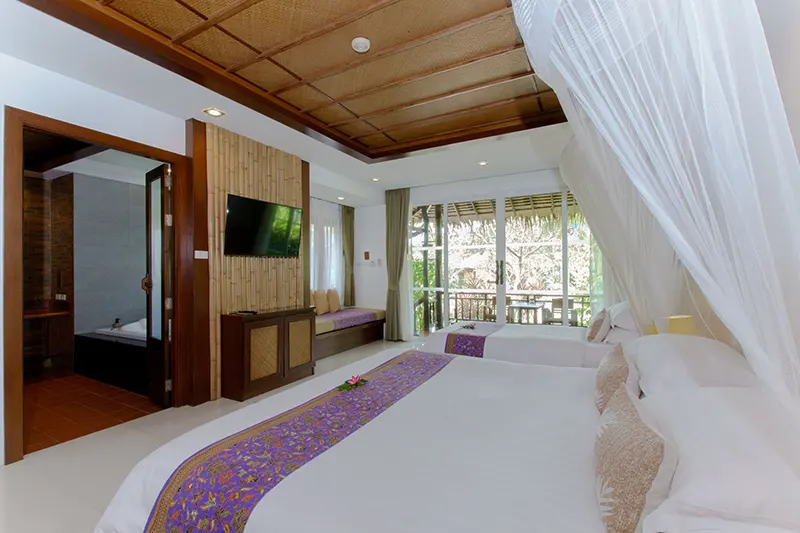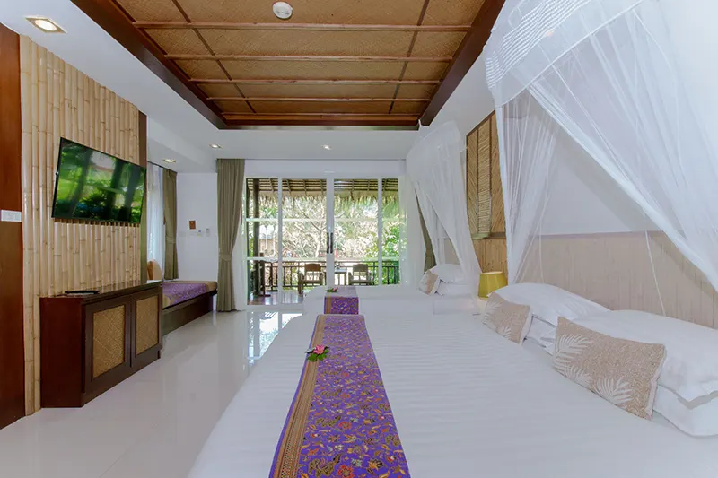 The Triplet Premier Cottages, each spanning 60 sqm.; offer an ideal setting for small groups, featuring two cottages with a king-sized bed, a single bed, and an en-suite bathroom with a whirlpool spa bath and a separate shower area. Opened in December 2015 and renovated annually, these semi-detached cottages provide private entrances for added privacy and convenience. They are the only cottages on the property with this unique bedding configuration, making them perfect for groups of three. Due to space limitations, no additional beds can be added. Located next to the Sainai Pool Villa and Tropical Family Cottage, the Triplet Premier Cottages are also close to the Grand Pond View Cottages and Sai Nai Restaurant, where guests can enjoy breakfast and dinner.